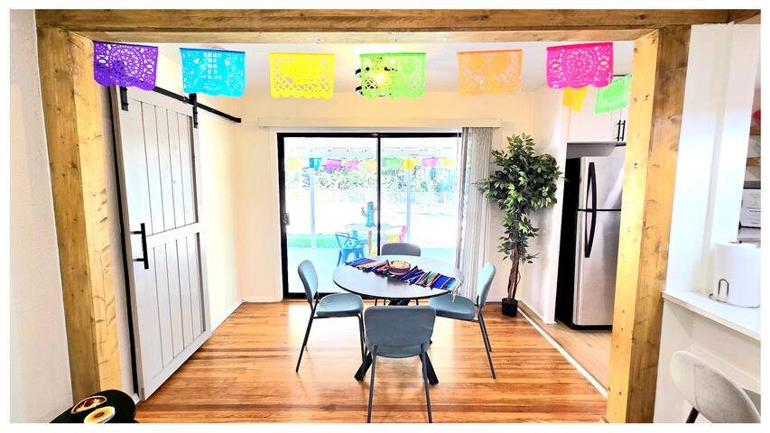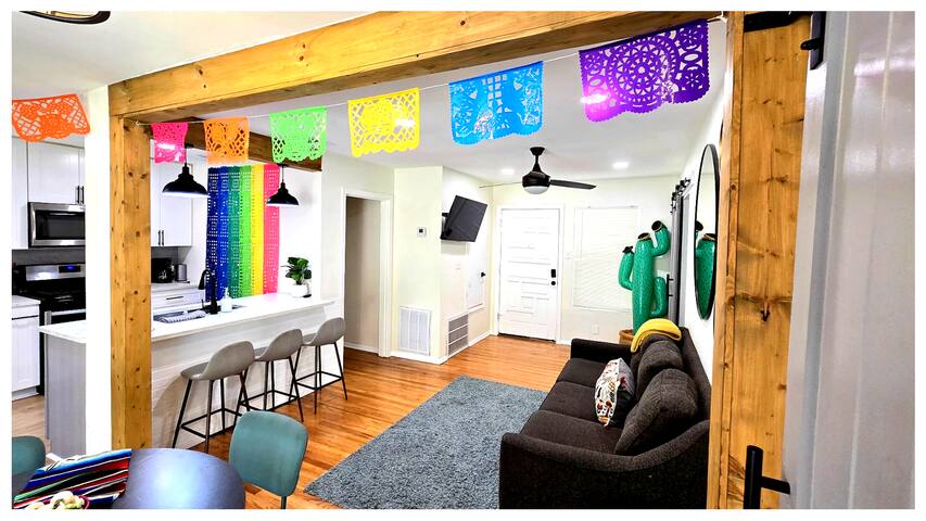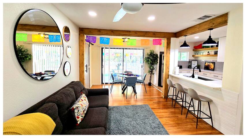 Modern twist on a classic 1950s home, freshly revamped with a vibrant Fiesta theme! Located in the heart of San Antonio, this stylish retreat blends retro charm with contemporary comforts for a unique stay experience.